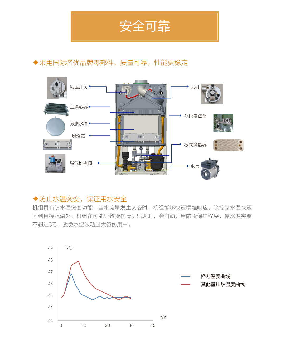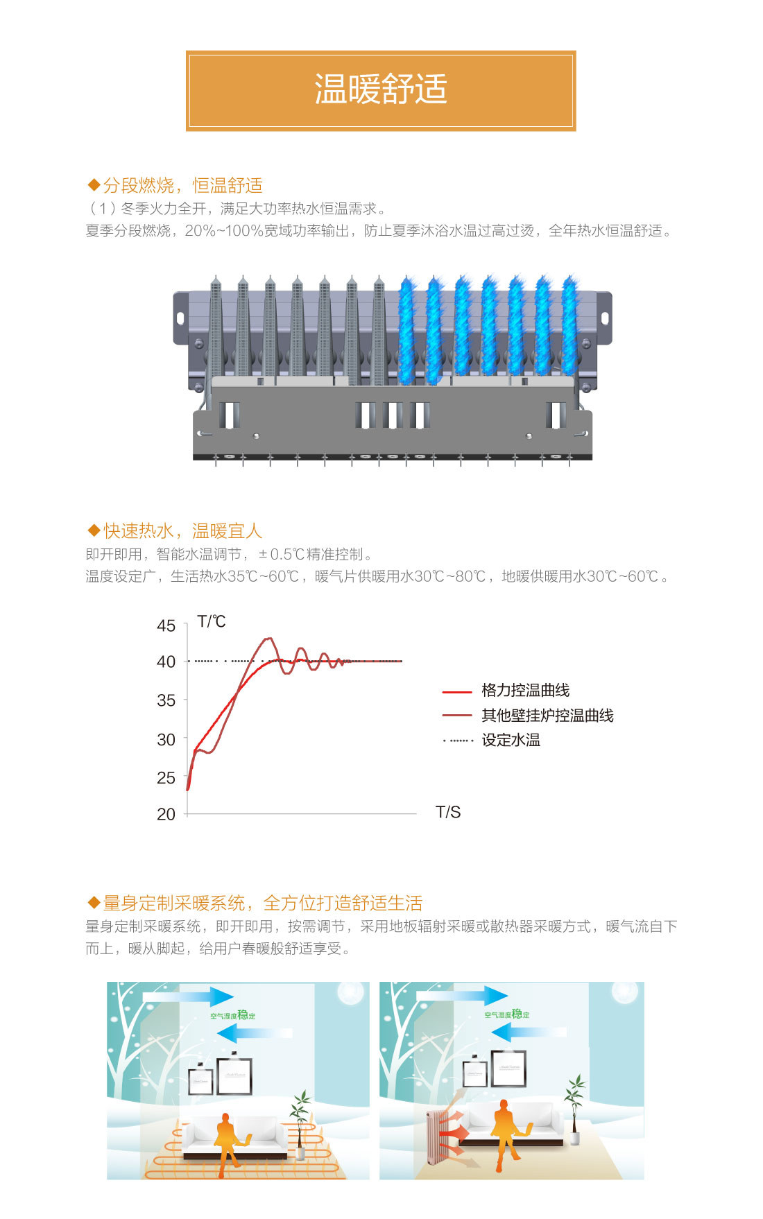 分段燃燒,20%~100%寬域功率輸出,防止夏季水溫過高過燙,智能水溫調節(jié),±0.5℃精準控溫,溫度設定廣,生活熱水35℃~60℃,暖氣片供暖用水30℃~80℃,地暖供暖用水30℃~60℃
