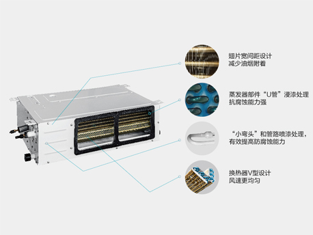 廚享內機采用金色防腐翅片換熱器,抗腐蝕能力強,翅片采用寬間距設計,可減少油煙附著:換熱器采用V型設計,使風速更均勻。